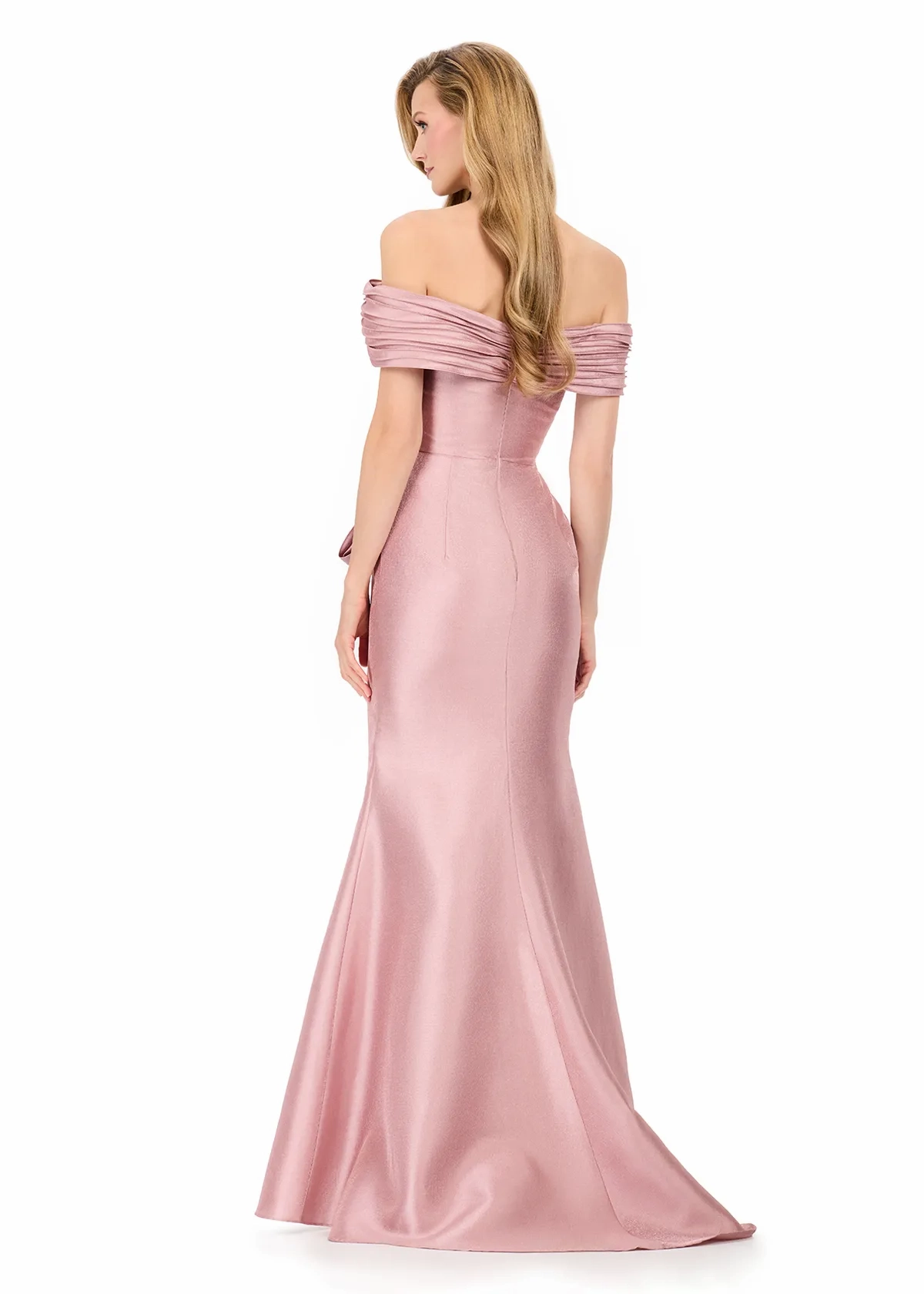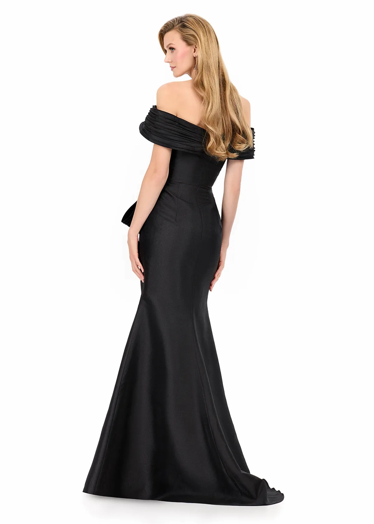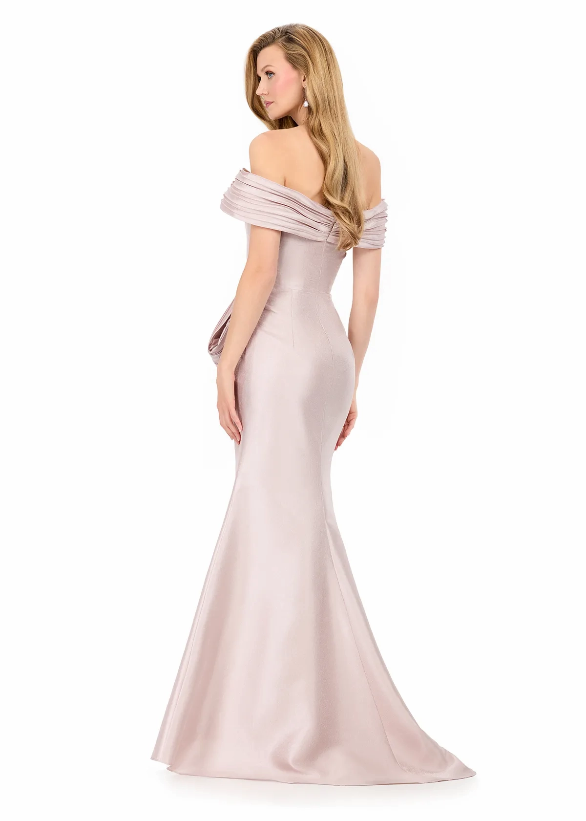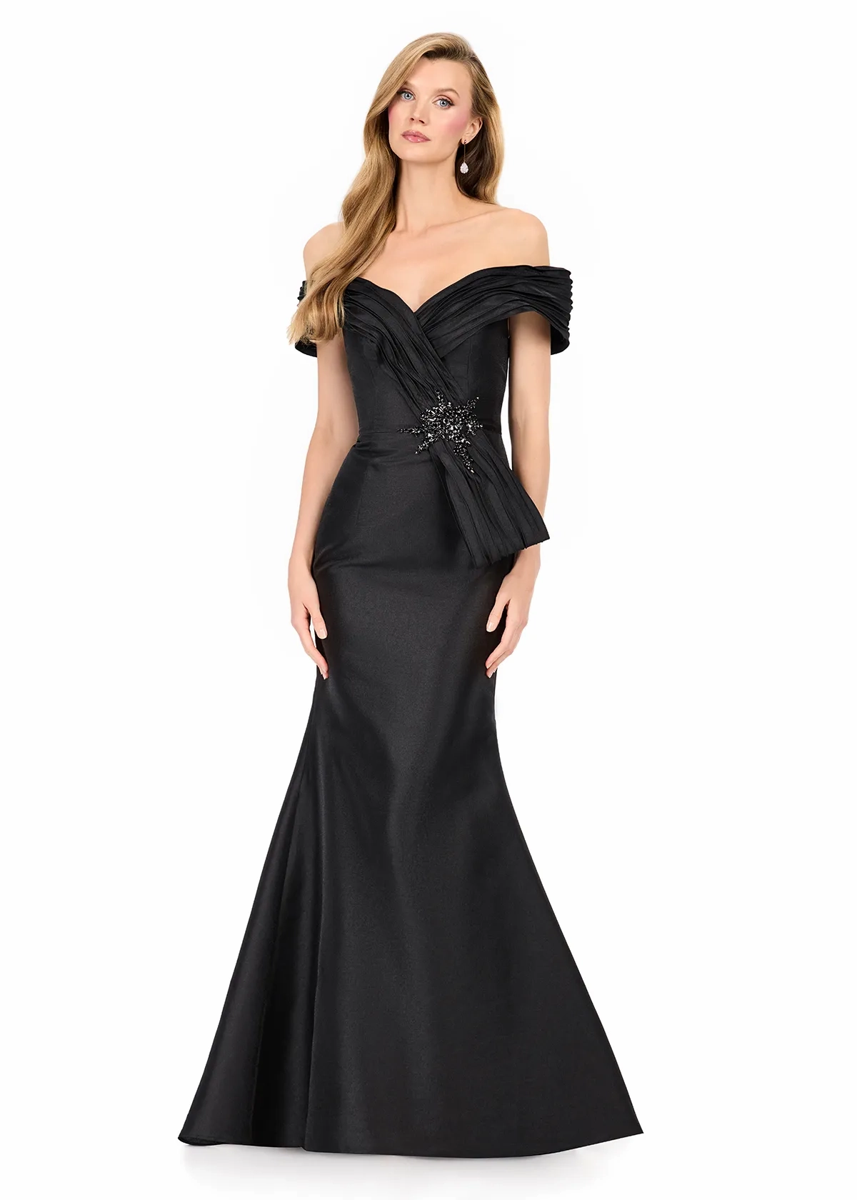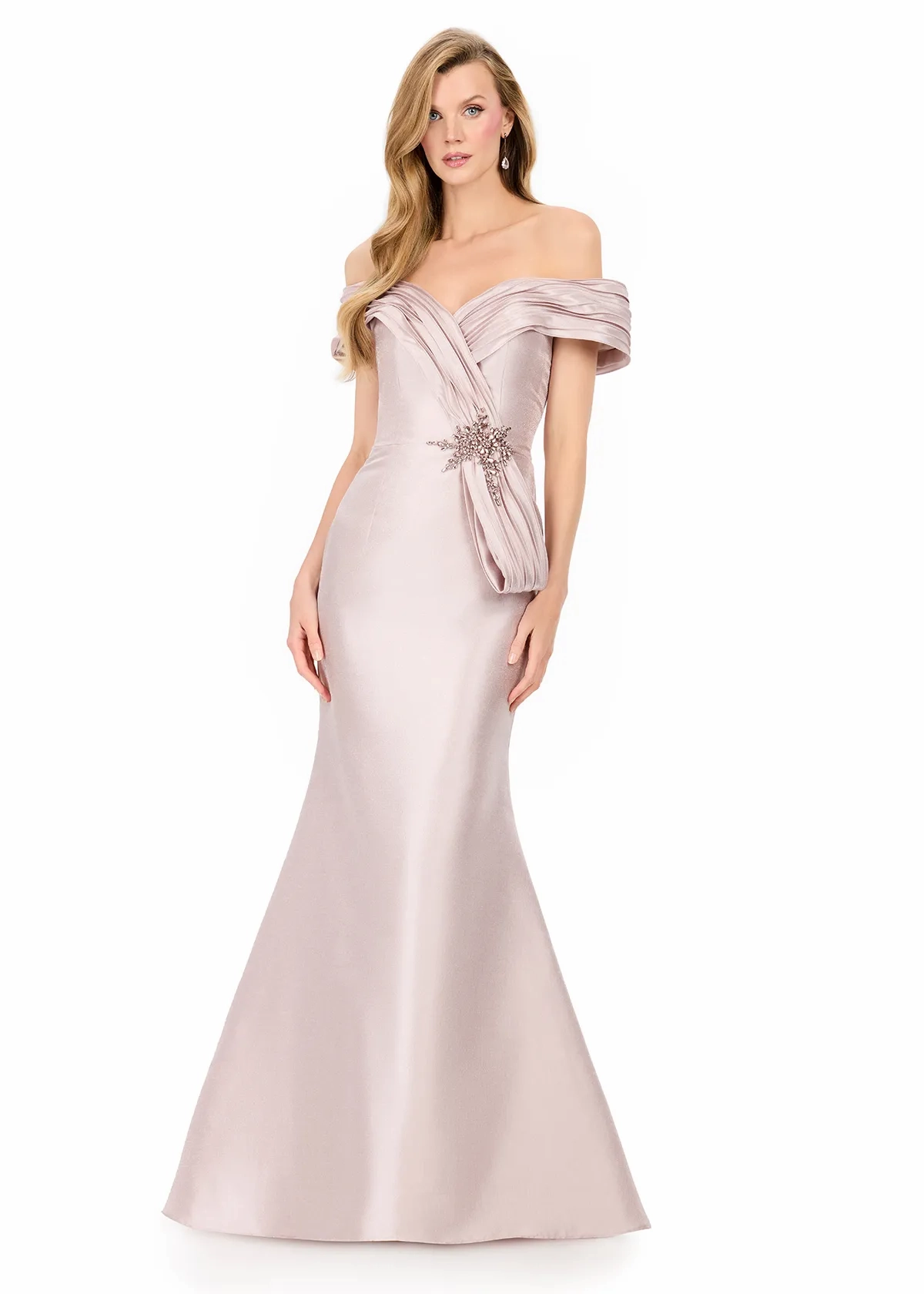 Make a timeless impression in the ASHLEYlauren E12103, a structured off-the-shoulder evening gown crafted from luxurious Mikado fabric. This figure-flattering mermaid silhouette features pleated detailing across the neckline and a cinched waist accentuated by a statement bow and sparkling crystal embellishment. Ideal for formal weddings, black-tie galas, mother of the bride moments, or even prom with a vintage twist, this gown is the perfect blend of elegance and modern sophistication. The fitted bodice sculpts the waist and hips before flaring at the knee, while the structured Mikado fabric adds refined shape and hold. The off-the-shoulder neckline enhances the décolletage for a romantic, elevated finish.
