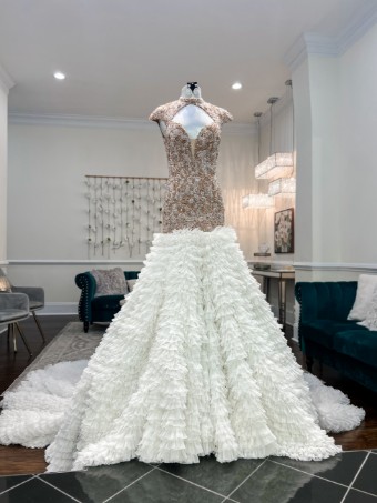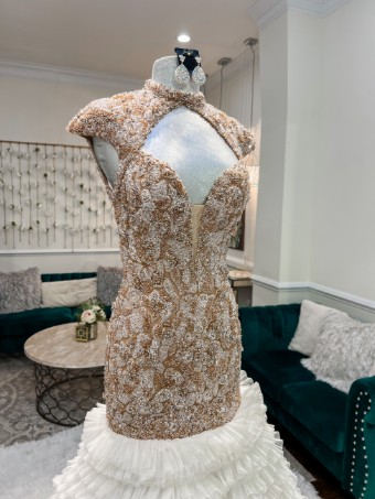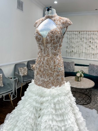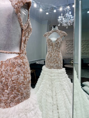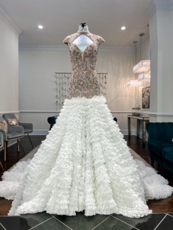 Serving you ALL the drama, this stunning mermaid gown is full of tiered tulle that keeps on giving! The fully beaded bodice has an open back, crew neckline with cutout and cap sleeves.