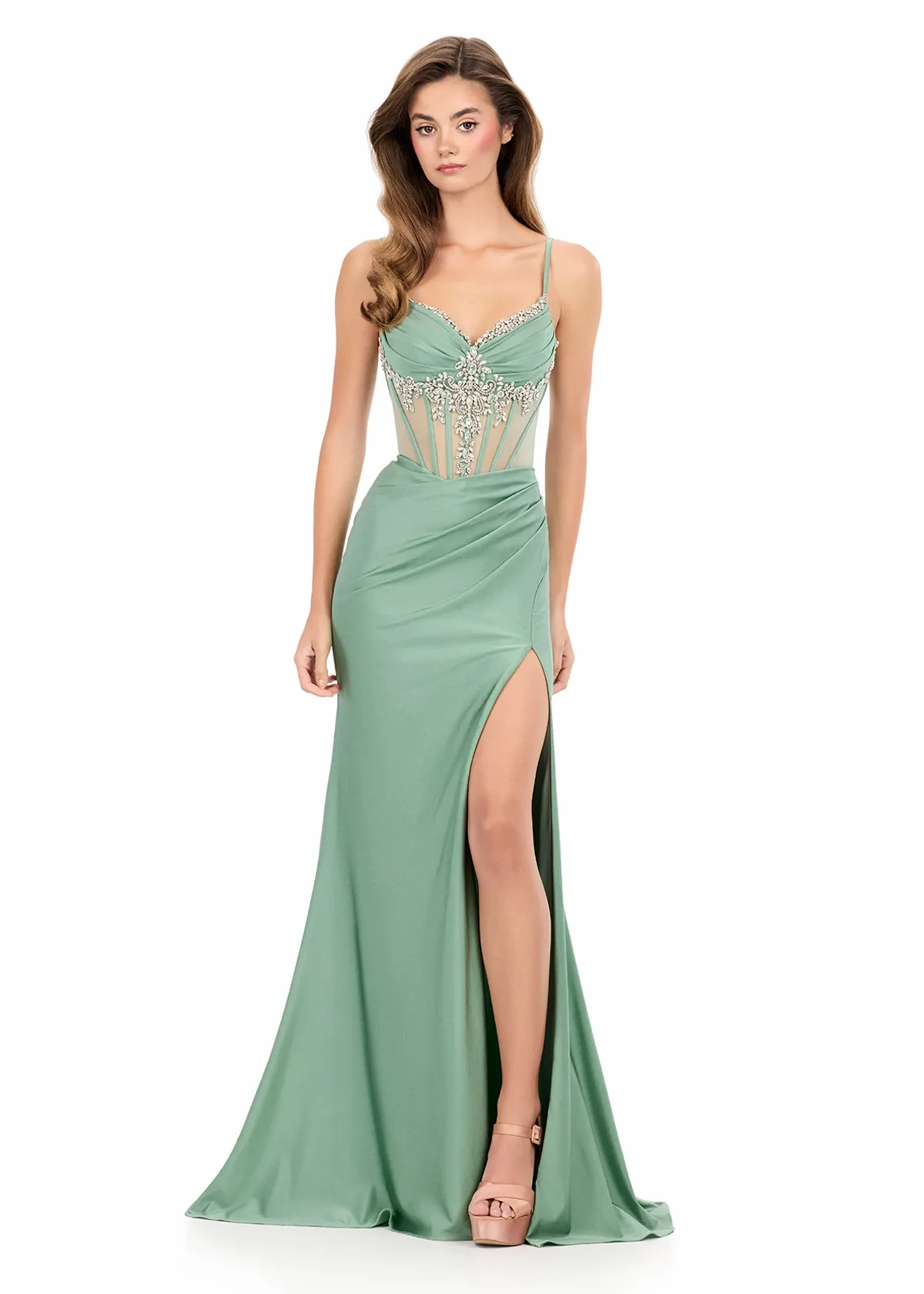 Turn up the glamour in ASHLEYlauren Style 12249, a striking jersey gown designed to contour your shape and command attention. The beaded corset bodice features structured cups, intricate crystal embellishments, and multiple straps for a dramatic, elevated look. The ruched waistline flatters the figure, while the fitted skirt and sweep train create a sleek, runway-worthy silhouette. With a lace-up back for customizable fit, this gown blends sparkle and sophistication effortlessly.