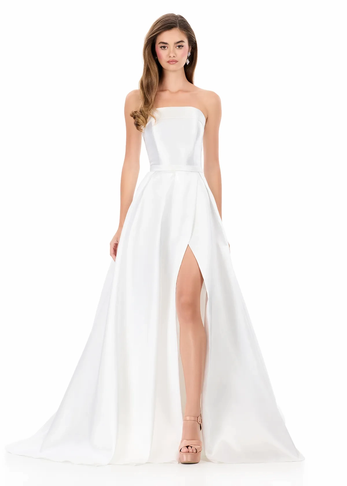 Be elegant and timeless with a modern twist in this strapless Mikado ball gown crafted for breathtaking entrances. ASHLEYlauren Style 12297 features a clean neckline and structured bodice highlighting the waist, while the full skirt drapes into a dramatic silhouette. Sophisticated sheen and classic charm make this gown a standout choice for any formal stage.