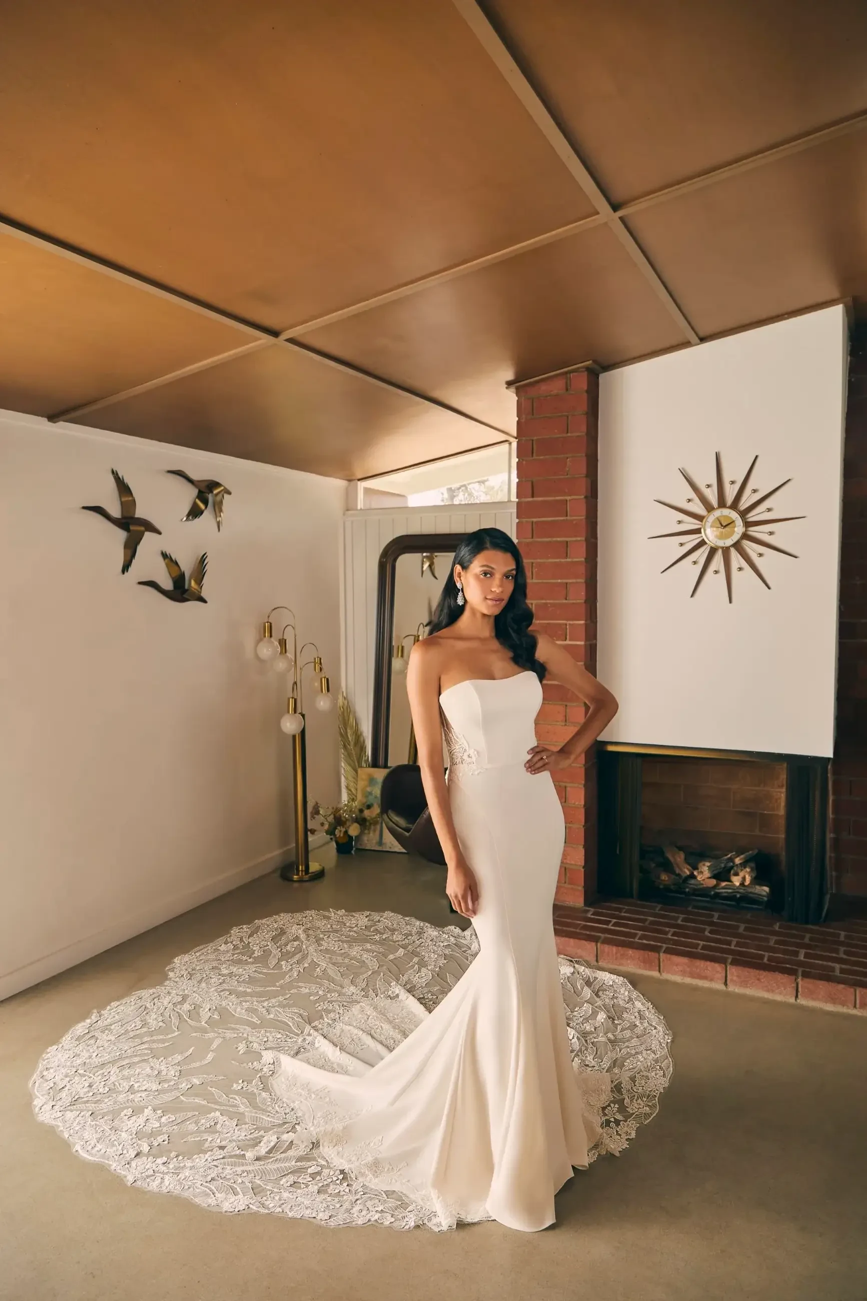 This sexy, strapless gown was made for the summer bride who wants to wow her wedding guests. The cascading lace train is breathtaking, and we love the sleek column silhouette that highlights your curves perfectly!