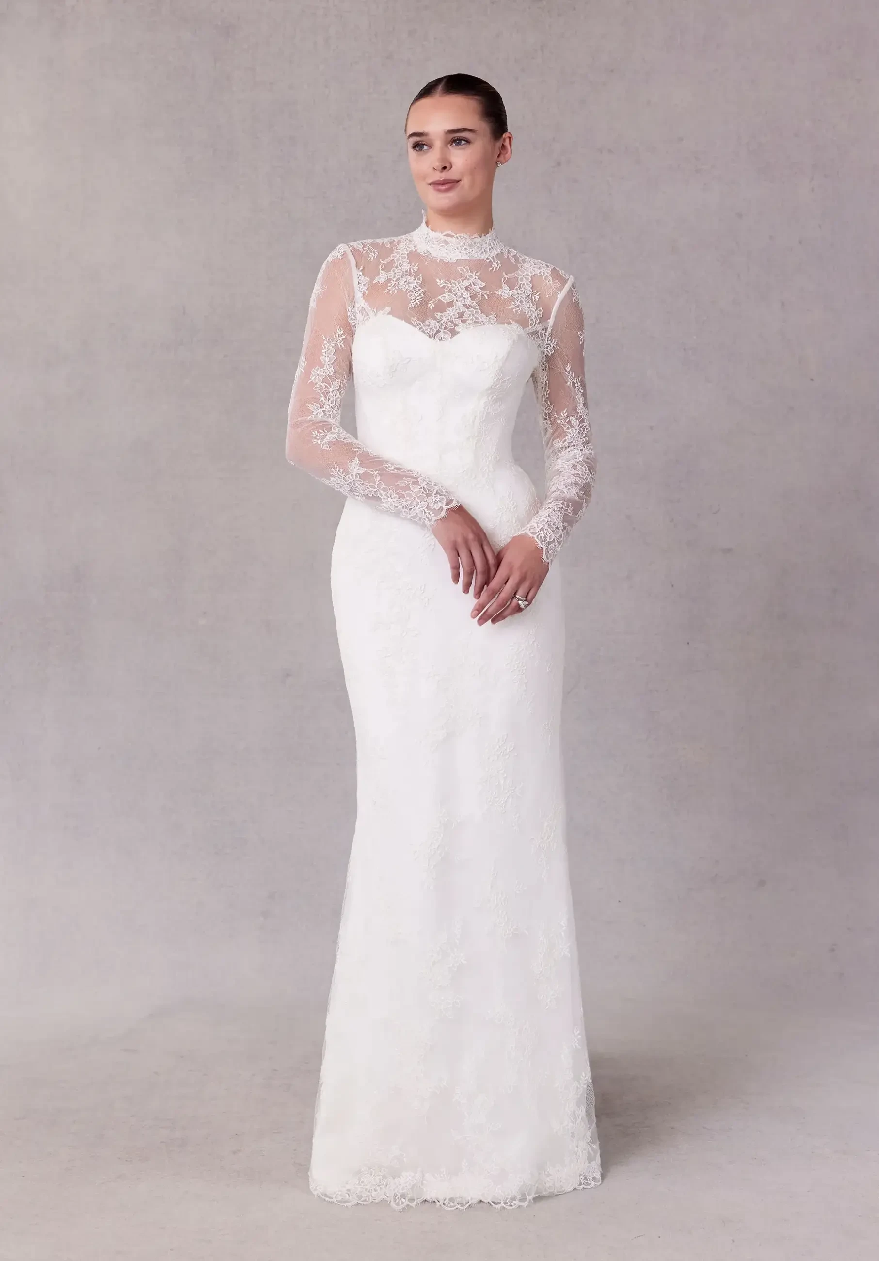 Stay chic and cozy with a high neckline wedding gown. This timeless trend offers sophistication and warmth, making it perfect for a winter celebration. Whether you prefer sleek mock necks or ornate lace designs, high necklines add an extra touch of elegance to your bridal look.