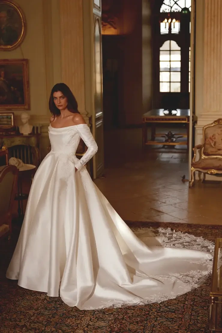 Winter’s crisp simplicity lends itself beautifully to minimalist wedding gowns. Think clean lines, luxurious fabrics like satin or silk, and subtle details that exude sophistication. These gowns are perfect for the bride who values timeless elegance and wants her look to complement, rather than compete with, the season’s natural beauty.