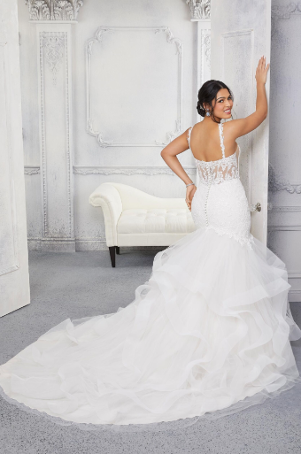 Frosted, Re-Embroidered Lace Appliques on a Flounced Tulle Mermaid Gown with Horsehair Edging