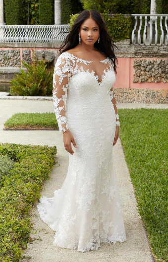 Frosted, Embroidered Lace Appliques on a Fit and Flare, Net Over Chantilly Lace Gown with Scalloped Hemline and Sheer Petal Train