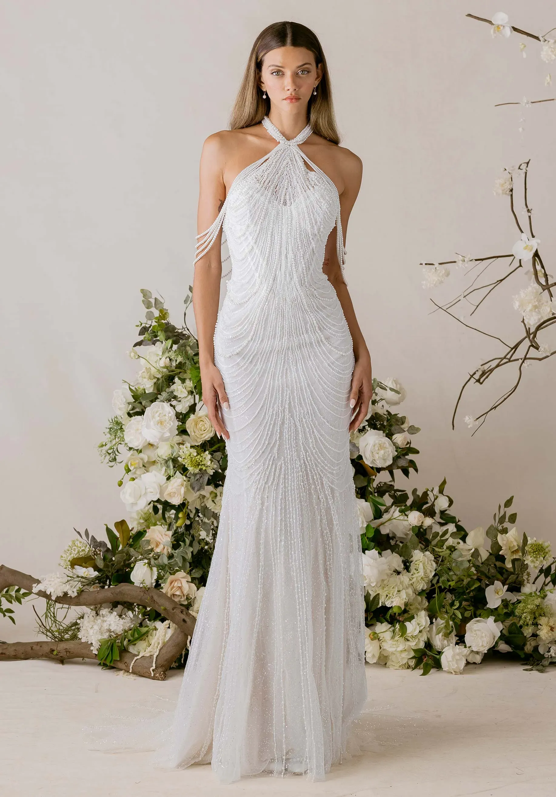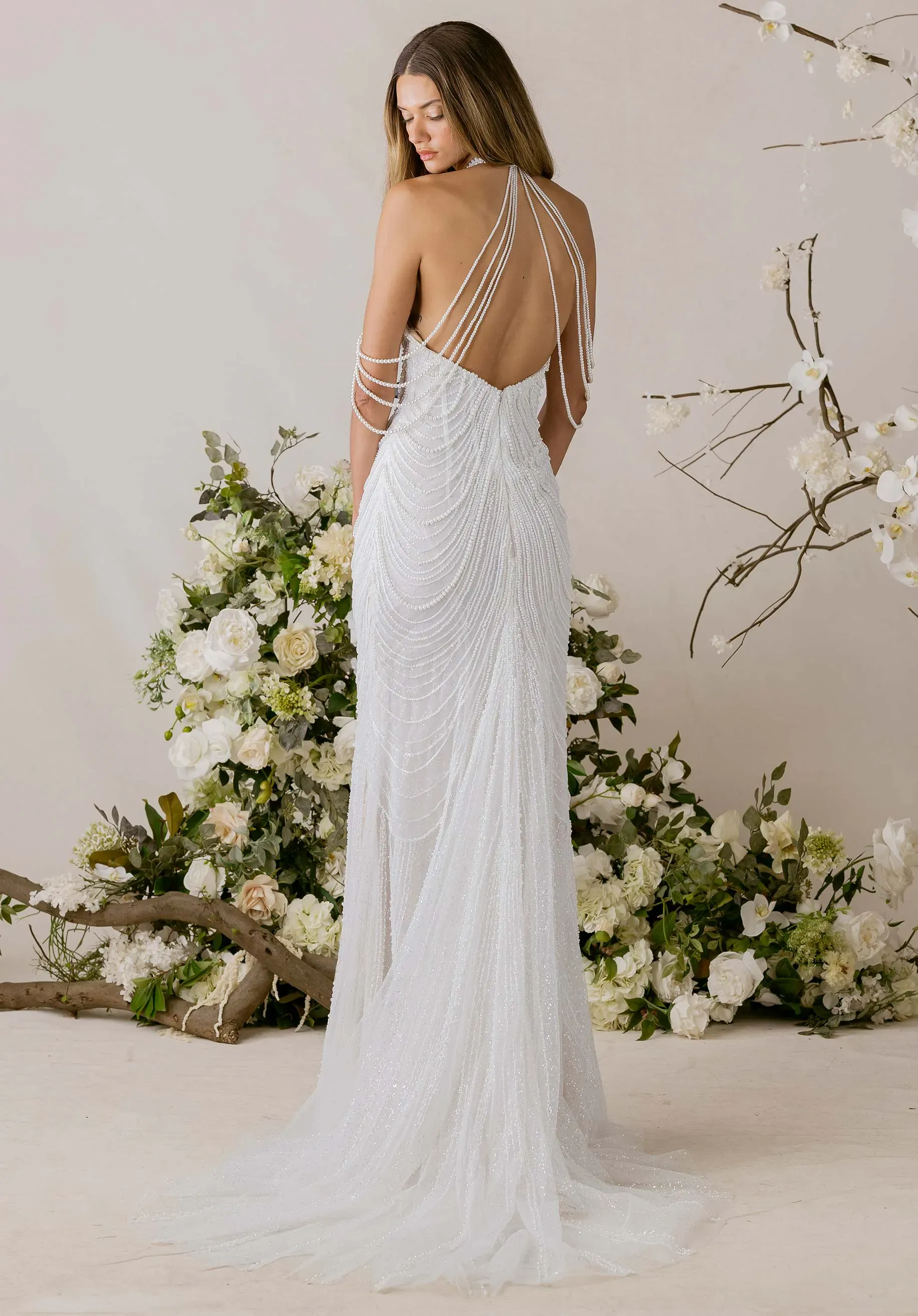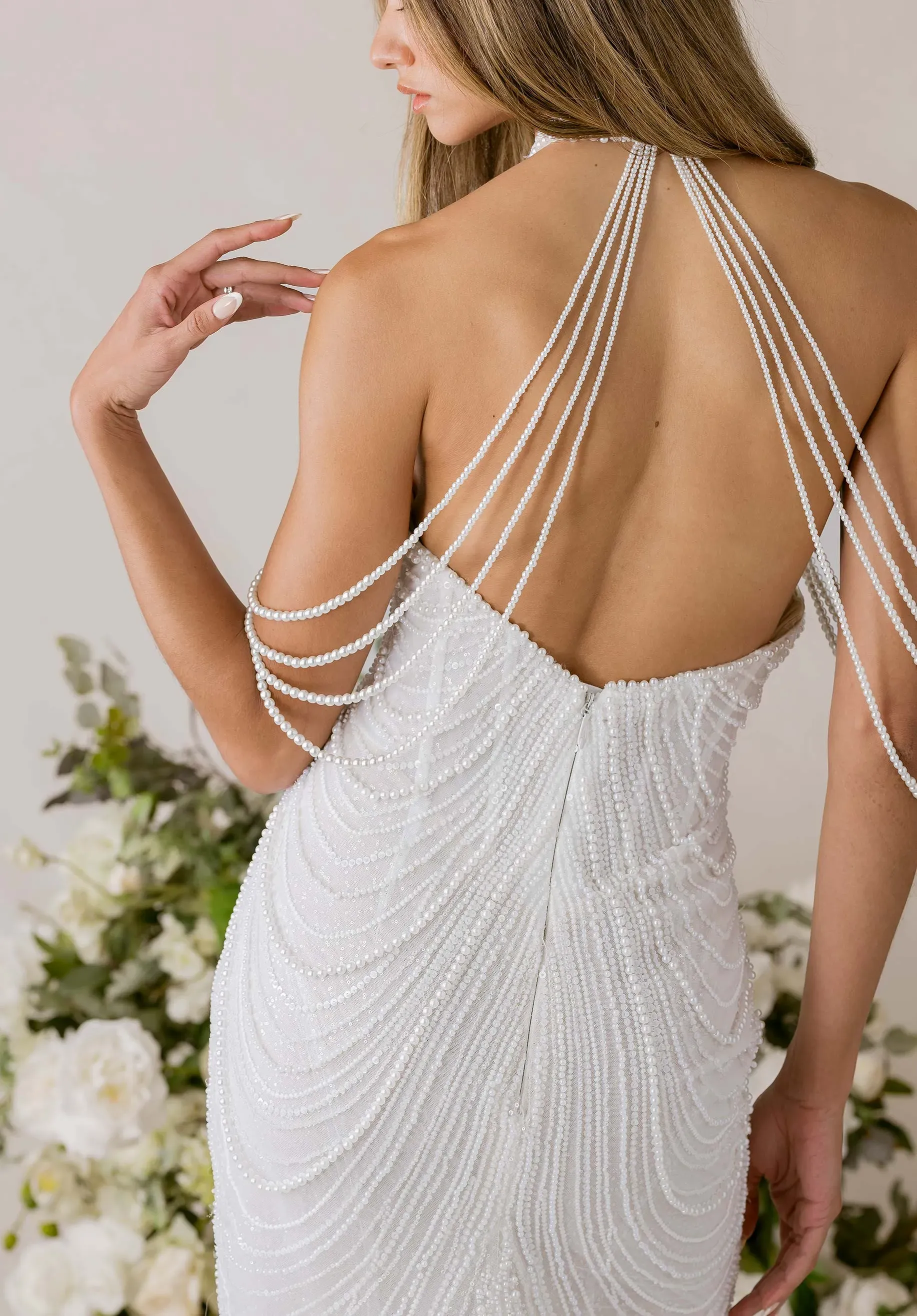 Radiant and striking, our Adagio wedding dress deserves a standing ovation. This sheath gown features a halter neckline with chandelier straps that frame the shoulders with refined glamour, while the open back adds a whisper of allure. Draped pearls cascade across the silhouette in shimmering waves, catching the light with every step like a dancer under the spotlight. Sleek, sculptural, and effortlessly poised, the gown balances glamour with ethereal movement for a truly unforgettable look.